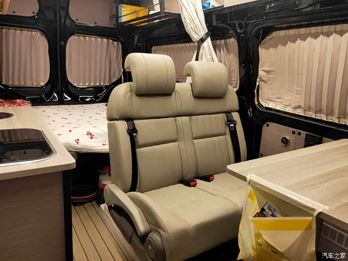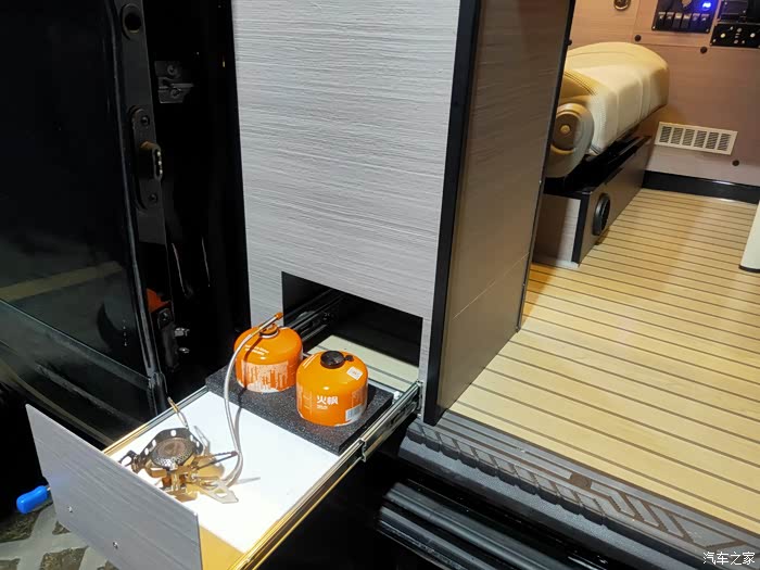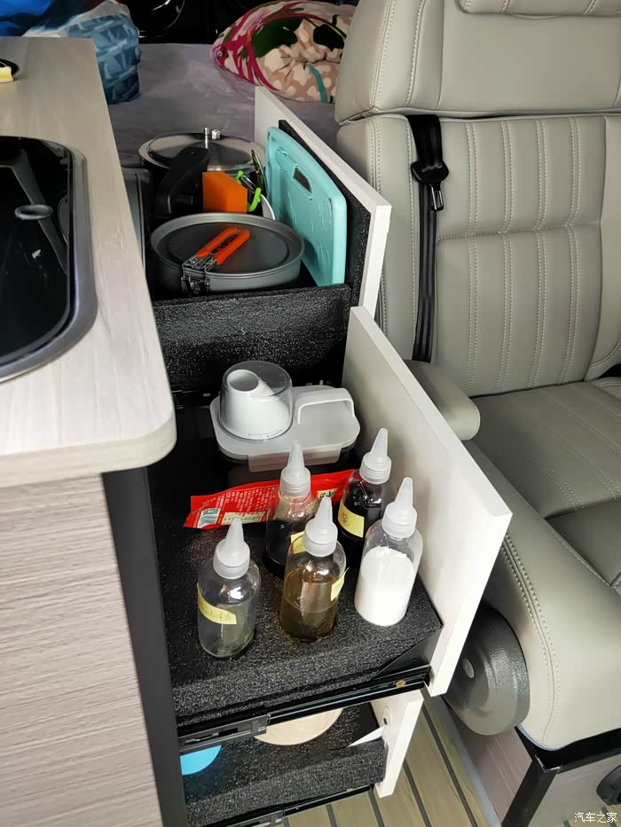 油盐酱醋,锅碗瓢盆都是一个萝卜一个坑的固定放,包括冰箱,这样车子开起来不会有噪音