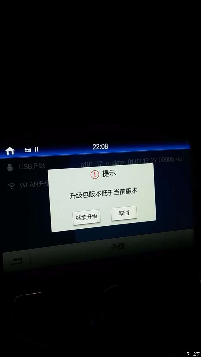 插入U盘,点击系统升级提示升级包低于当前版本,点击继续升级。