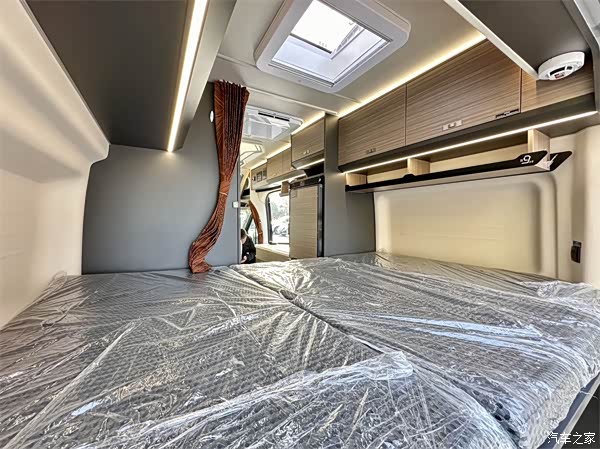 尾部休息区采用可变纵床设计,平常收起可空出过道,方便车内人员走动;床板放下后床铺尺寸为2.05m×1.3m,两侧均做了外扩处理,宽敞舒适,可轻松满足两人安稳休息,为疲惫的旅行者提供温馨的睡眠港湾。床板下方两侧都有储物空间,方便存放物品;上方是储物吊柜,进一步增加车内储物能力,让旅途物品都能妥善安置。此外,休息区还配备阅读灯等设施,为乘客提供舒适的休息环境,在疲惫的旅途中也能拥有优质睡眠,以饱满精神迎接新一天的旅程。