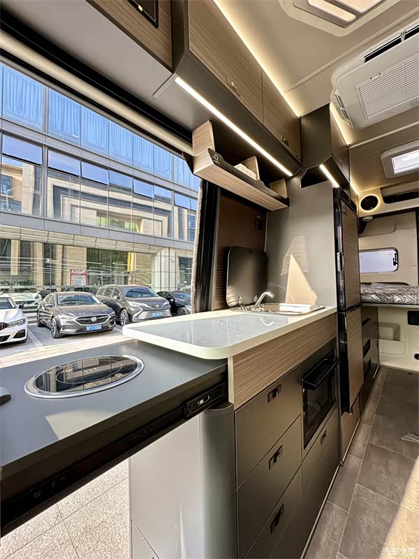 厨房区位于车身右侧,得益于整体布局和多处抽拉式设计,一体式橱柜几乎从副驾驶后方延伸到尾部床铺处,操作空间十分宽敞。台面采用推拉式延伸设计,可根据烹饪需求灵活拓展,让烹饪更加得心应手。厨房配备抽拉式电磁炉、带盖铝合金洗菜池、多个抽拉柜、烤烘一体微波炉以及102L双开门冰箱,满足各种烹饪需求和食材储存需求,即使在旅途中也能轻松烹制美味佳肴,享受家的味道。外置柴油灶与车内厨房形成互补,满足多样化烹饪需求,在户外也能大展厨艺。