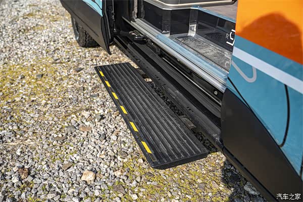 瑞弗启界R900四驱的外观造型个性张扬,设计感十足。整体尺寸为5998×2194×2950mm,车长控制在6米内,符合蓝牌C照驾驶标准,让更多人能轻松驾驭它踏上旅程。车身以黑色为底色,搭配亮橙、青色和白色的图案与文字点缀,撞色设计大胆又不失时尚,开在路上回头率爆表。前脸的“满天星光”进气格栅,宛如繁星汇聚,搭配造型犀利的LED大灯组,不仅照明效果出众,还极具辨识度,科技感与时尚感拉满。车顶的美规铝合金行李架,实用又美观,可放置行李、自行车等装备;车身侧面的熏黑遮阳棚,带有外凸式设计和户外照明灯带,驻车时展开,瞬间营造出惬意的户外休闲空间。车尾对开门设计方便装卸大型物品,门上固定的铝合金爬梯,方便清理车顶和放置行李;右侧车门处外置储物仓打开可变形为柴油灶,满足户外烹饪需求,为旅途增添烟火气息。值得一提的是,它还配备了全地形AT轮胎与哑光黑轮毂,不仅抓地力强,能轻松应对泥泞、砂石、积雪等复杂路况,造型也独特酷炫,将性能与颜值完美结合;车侧双脱困板及尾部AT备胎的配置,进一步提升了车辆在极端环境下的脱困能力 ,保障越野探险的安全。