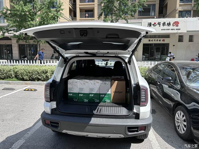 大狗的空间是我最满意的地方之一。后排坐三个成年人不会觉得挤,而且地板几乎是纯平的,中间乘客的脚也有地方放。后备箱塞过两个大行李箱+一堆年货,还能再塞几个背包。最让我惊喜的是车内的储物格设计,中控台下有专门放手机的地方,门板上能塞两瓶水+一把伞,扶手箱深度也够用。对于我这种喜欢在车里堆东西的人来说,简直太友好了!