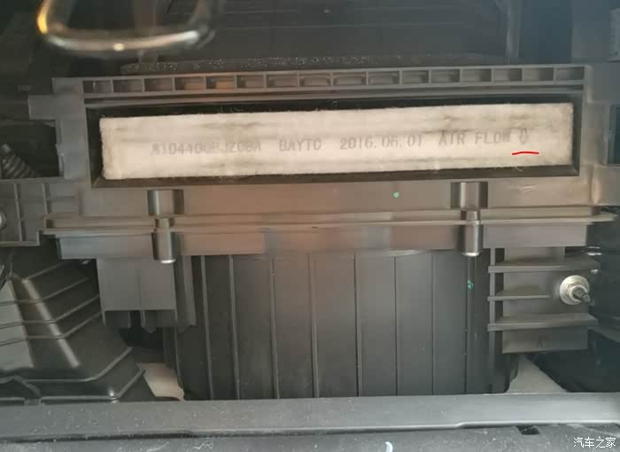 露出空调滤芯了,直接抽出就可以了,注意,其箭头标识是向下的,等下装新的时候,要注意这个方向。