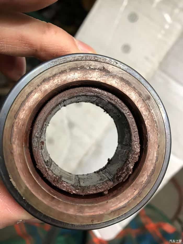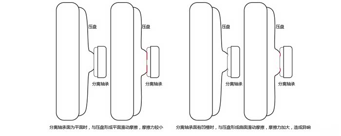 换完之后,踩离合就再也没有异响了,这里再针对图片,简单说下我对病症的分析,离合器压盘是一个菊花形状的弹簧片,踩下离合器之后,多机构产生作用最终由拨叉推送分离轴承压压盘,此时离合器片和发动机飞轮的分离,由于压盘弹簧的张力很大,在分离轴承还是全新平面的时候在积压的过程中可以形成力度较小的滑动摩擦,但如果分离轴承磨损形成凹槽之后,这个滑动摩擦力必然会加大,同时由于凹槽会形成沟壑,与压盘摩擦力加大导致过程中发出咯吱咯吱的声音,但冷车的时候没有这个声音,只有热车才会有,可能是热胀冷缩的原因吧。