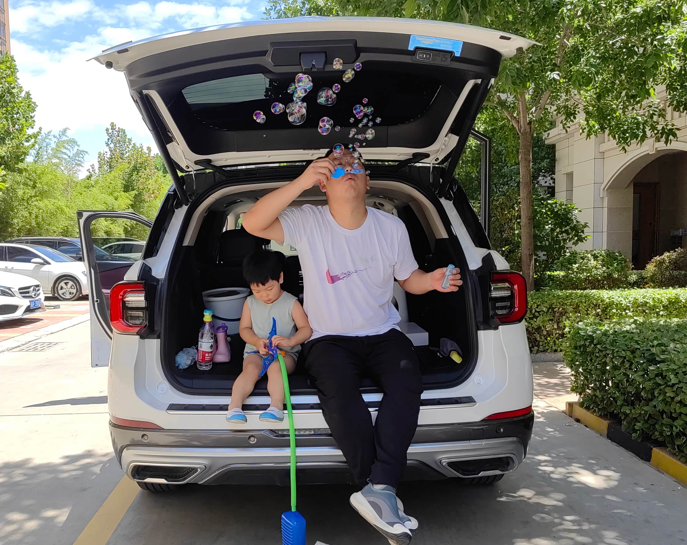 后备箱打开就可以临时休息吹泡泡时间到!