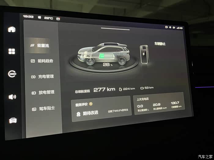 开启ACC测试:下午17:40,在高速公路收费站B入口附近记录车辆里程信息,具体如下:总里程3:2403km,纯电续航3:99km,油续航:224km。此时天气预报温度26℃。记录完毕后通过ETC入口进入高速行驶,回程进入高速公路主干道立即开启ACC,设定时速100km/h。全程开启空调,设置为24℃,内循环,1档风力。18:08在高速公路收费站A出口通过ETC出收费站,通过疫情检查站后靠边停车记录此时车辆数据:总里程4:2439km,纯电续航4:58km,油续航:224km。此时天气预报24℃。汇总数据,回程总计行驶36km,用时28min,均速76.6km/h,掉电41km。掉电和行驶里程1.14:1。
