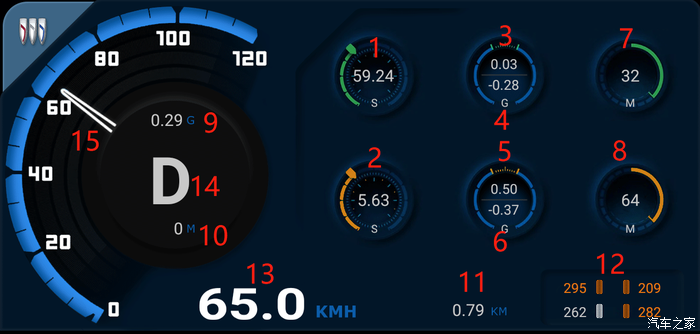 8)0-100加速时间,加速G值
