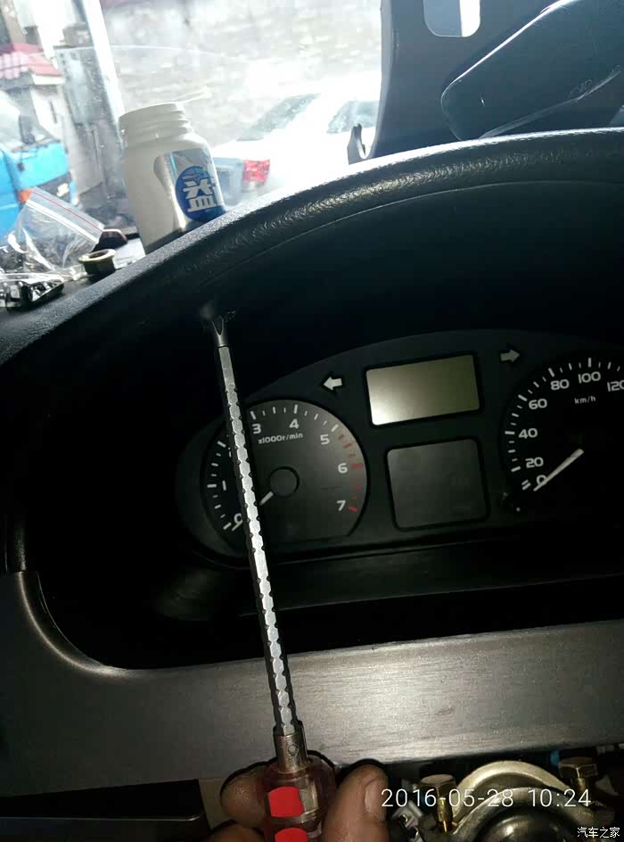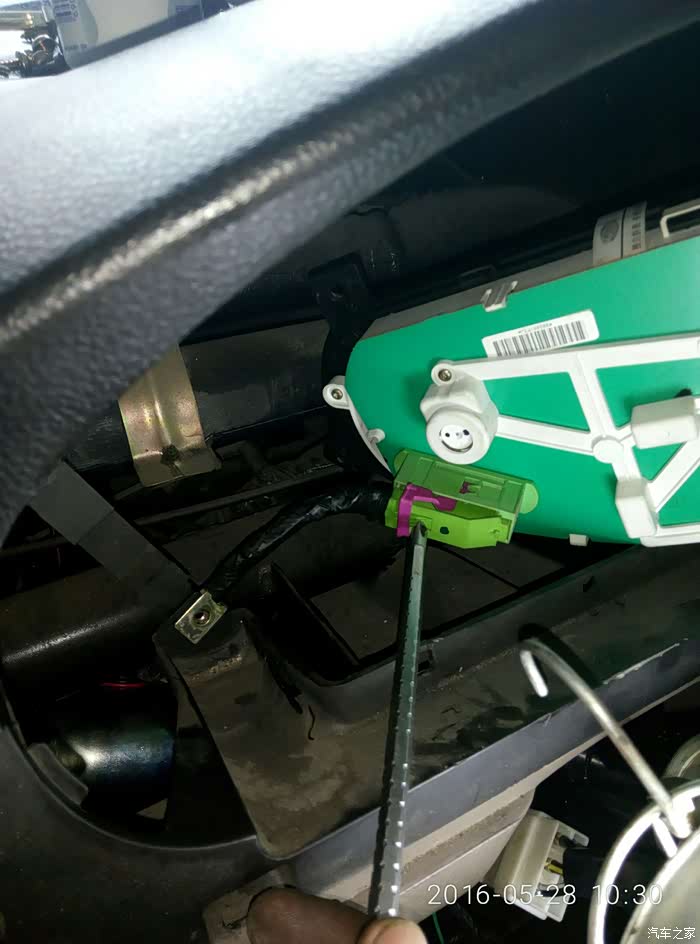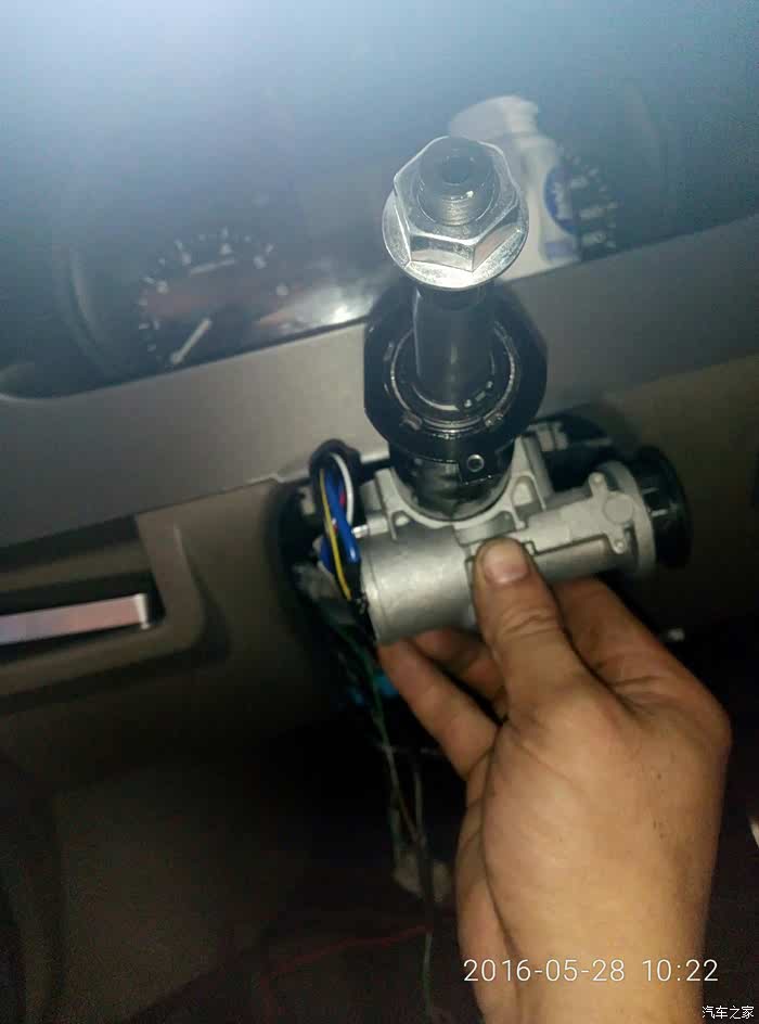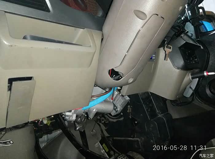安装点火开关、控制盒和接线。首先把点火开关、控制盒插头一一插好,把控制盒牢固。在点火开关关闭状态下用电笔探测有电的接红色粗线,在点火开关打开状态下有电的接白色,红色细线接仪表蓝色带银点的那条线(看图),黑色当然就搭铁了