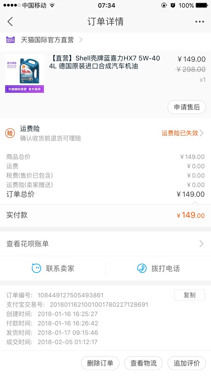 天猫国际购买壳牌机油 蓝壳5w40,测试中