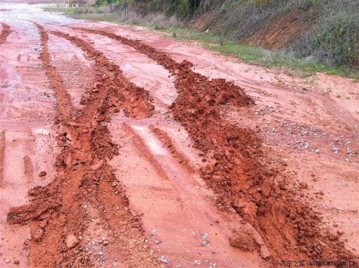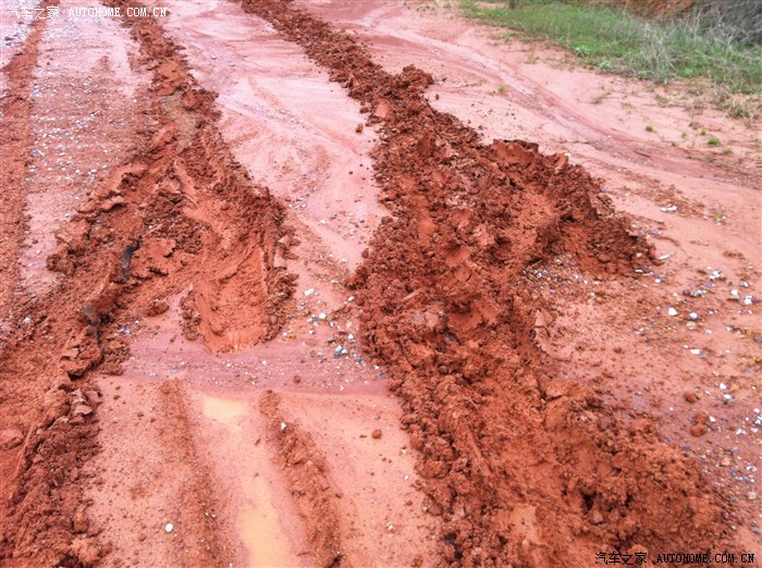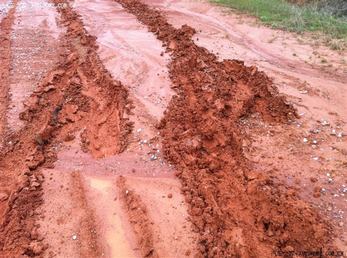 这两道是开回来的印子,陷住了。油门到底方向打死也出不来,前档玻璃和发动机盖后视镜都飚了好多泥巴,没顾得上拍照了。怎么办??开不出来我就倒车,倒车也失败了。。。。把ASR关掉再次油门到底方向打死,一挖一挖出来咯~~