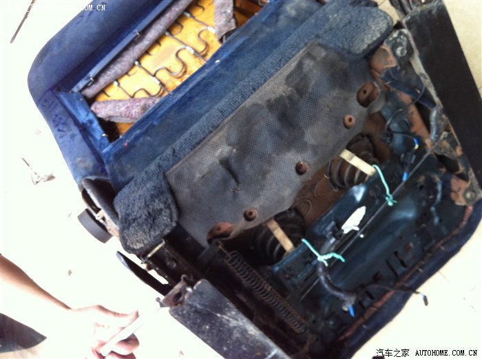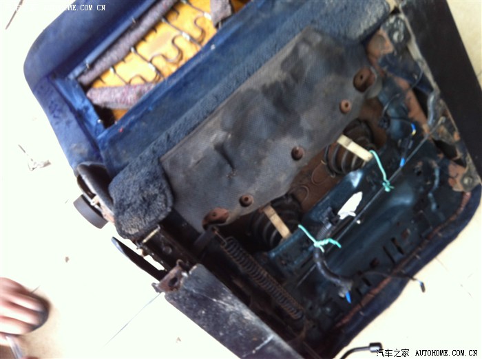 这两张图可以看到背部和坐垫下面都是带弹簧的,此种设计在现在车型上已经绝迹。非常舒适,过沟沟坎坎所有震动都过滤完。有锈迹,毕竟十多年的东西了,刷上防锈漆即可。一分钱一分货的道理在这个椅子上体现的很深刻,滑轨依然顺滑,弹簧无变形布料骨架无破损,海绵依旧柔软,各项调节都没问题。很多国产车弹簧和海绵用两三年就开始变形。看到座椅下面两块扁铁,就是后面焊接上去的,根据原车固定孔在扁铁上打洞,再用原装螺丝固定即可。纯手动调节座椅,无电机损坏故障风险。