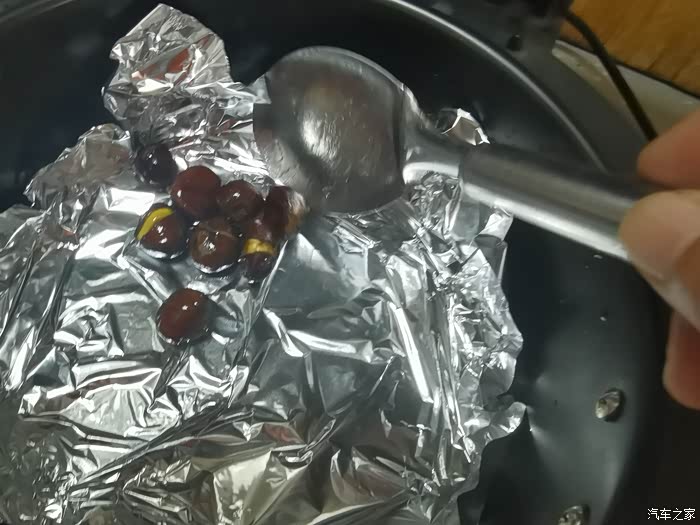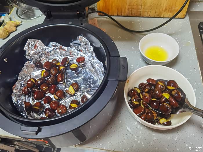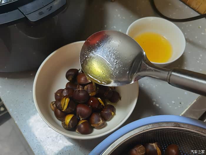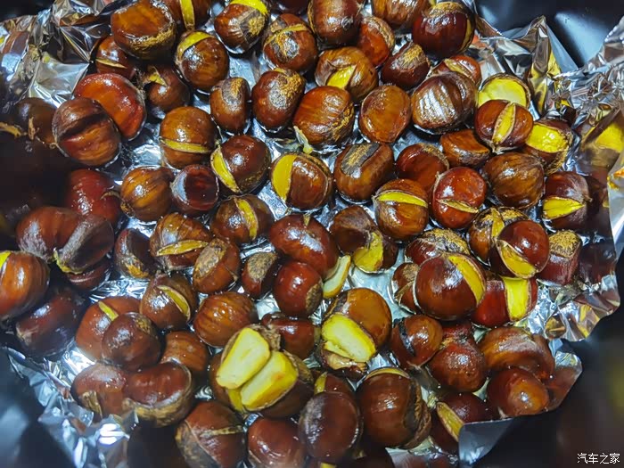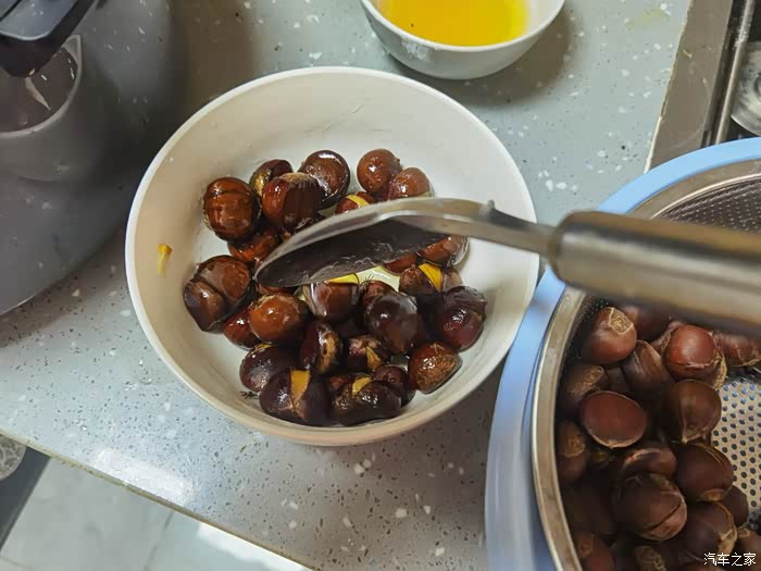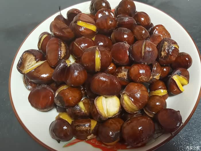 唯一不足的是;在处理栗子的时候,确实应该划十字刀,这样容易削壳,而划一字刀,削壳的时候,一掰就成两半了,不过不影响食用,半块办块的吃呗!
