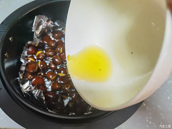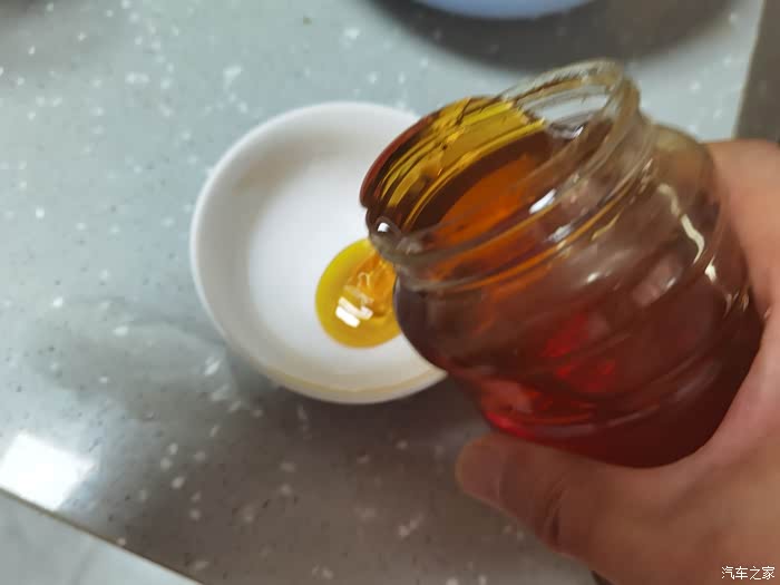 趁煮栗子的时候,取一个碗调个汁。蜂蜜,白糖,食用油,加点水搅拌均匀备用。