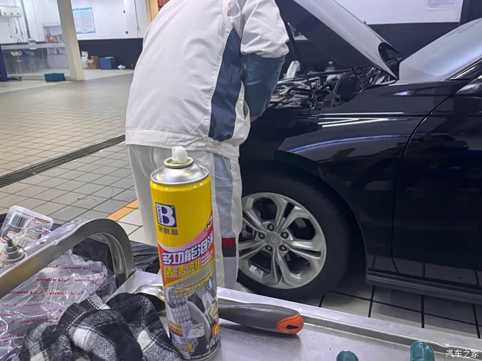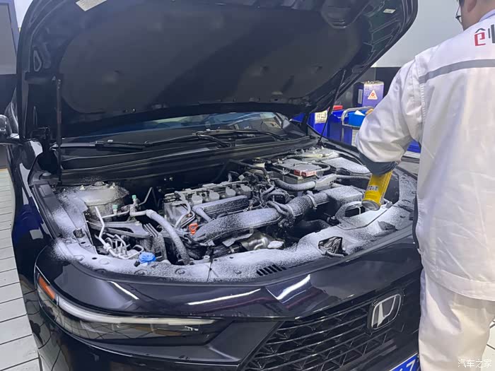 保养工作进入最后阶段,泡沫清洗剂清理了发动机舱,这是我预料之外的,说实话当他喷的时候,我有点慌。