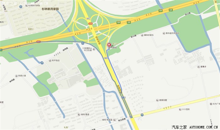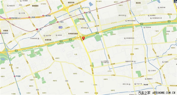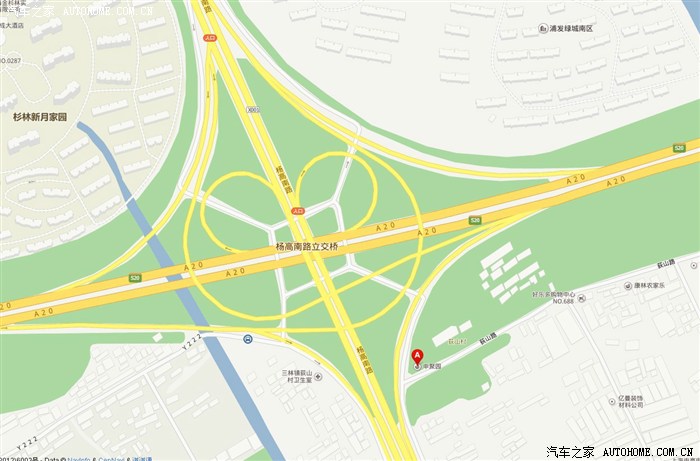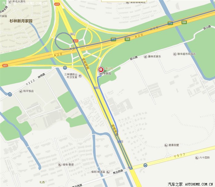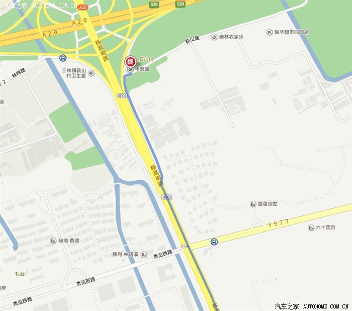 从S20东边过来的车友按照以下线图行驶,在杨高南路与秀沿路十字路口需要调头,然后靠右进辅路。