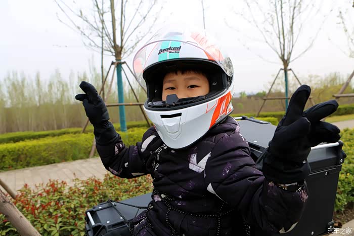 儿子开心的挥起双手做出了胜利的姿势,在他的童年经历里和汽车、摩托车已经密不可分了。