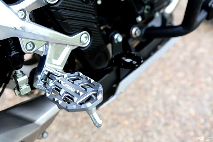 关于铝合金加宽脚踏这里我也要说几句,如果是街车或者仿赛,我绝对是不会更换这种脚踏的,原因是在正常骑行状态下,脚踩在这个脚踏上只能踩到一个边,和原车的脚踏脚感毫无区别,换它就属于无效投资。但是别忘了咱是要去摩旅的啊!骑过这类车的人都知道长时间骑行的时候,偶尔也会站起来骑行一会,让弯曲的胳膊腿伸展一下,让坐扁的屁股恢复一下弹性,这时候,这个脚踏的作用就发挥出来了,脚掌可以完全踏踏实实的落在宽脚踏上了,比原车的那个棍状的脚踏舒服的多。
