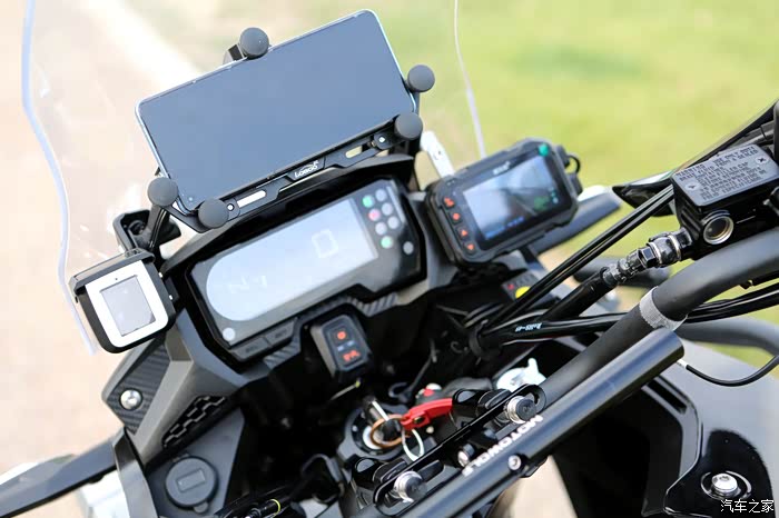 我不喜欢在车把上罗里吧嗦装一大堆东西,觉得会有些影响驾驶和美观,于是在仪表附近自己做了几个支架,将一系列的辅助装备都装在了这里。萝卜的自带无线充电功能的手机架很好用,手机架上去,一路上再不用充电了。左边的小显示屏是个胎压监测,上次在西汉高速上后轮胎中招后全靠它一路对漏气的轮胎状况让我了如指掌。