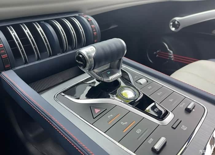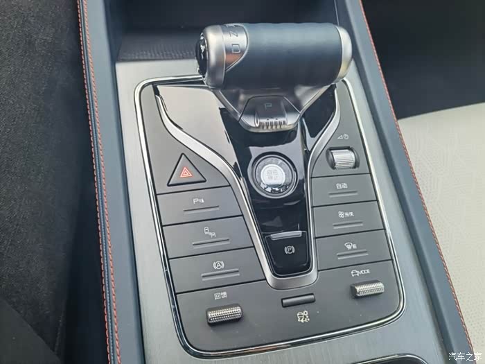 电子档杆的造型也和我所熟悉的车型有所区别,机械感很强,试了一下手感,握感跟推力感都不错。