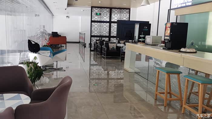 这个体验中心的客户服务区在二楼,干净整洁,有儿童区,水吧和小零食,沙发前的大屏幕还可以看到正在工位的车辆的维修状态信息、在线视频和预计交车时间,信息一目了然。