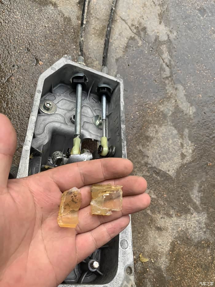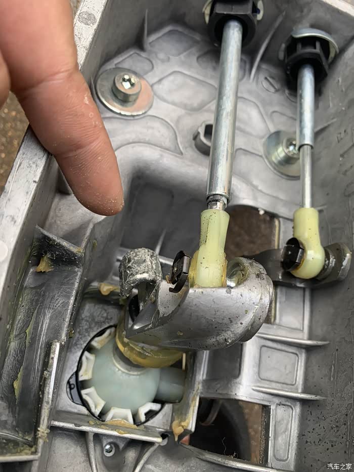 故障判断:查询资料以后发现是挡把轴一个黄色胶套碎裂了,导致不能固定挡把轴,让其来回转动,主要就是挂倒档