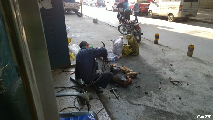 随便找了一家修车行,吊起车子,发现是手刹片碎了,摩擦的声音。由于店家没配件,店家把刹车里面的碎片倒出来,继续上路了,费用50元。