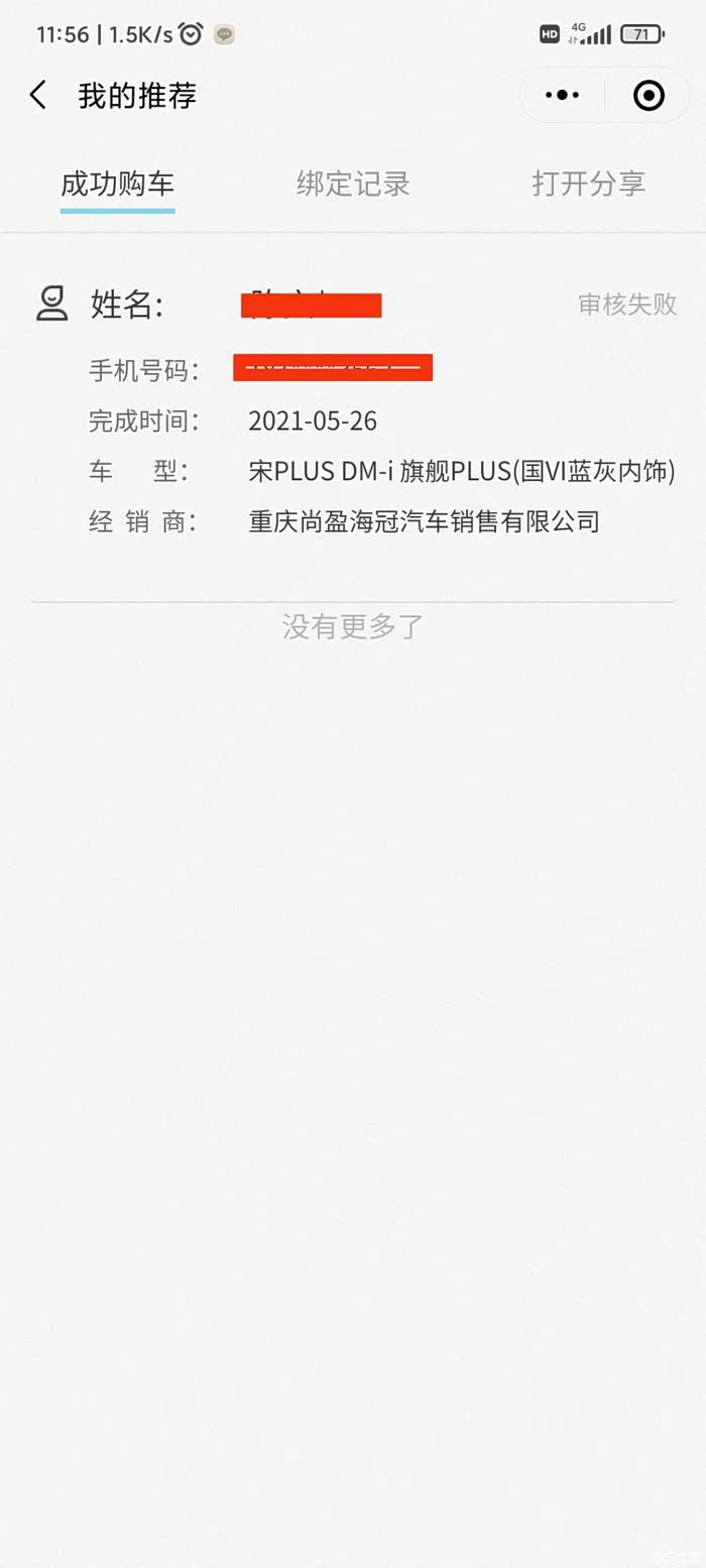 双享积分推荐,我能看到是15号绑定的,26号完成购车的。审核失败了,找比亚迪客服,说要提供被推荐人的姓名电话。我论坛上分享的,我又不知道谁绑定的。想要积分太难