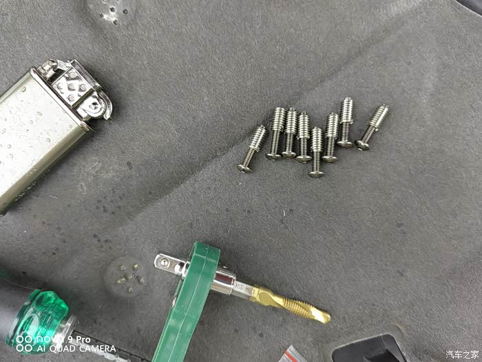 找到了合适的工具,棘轮扳手,攻钻一体丝锥,螺丝,牙套等。