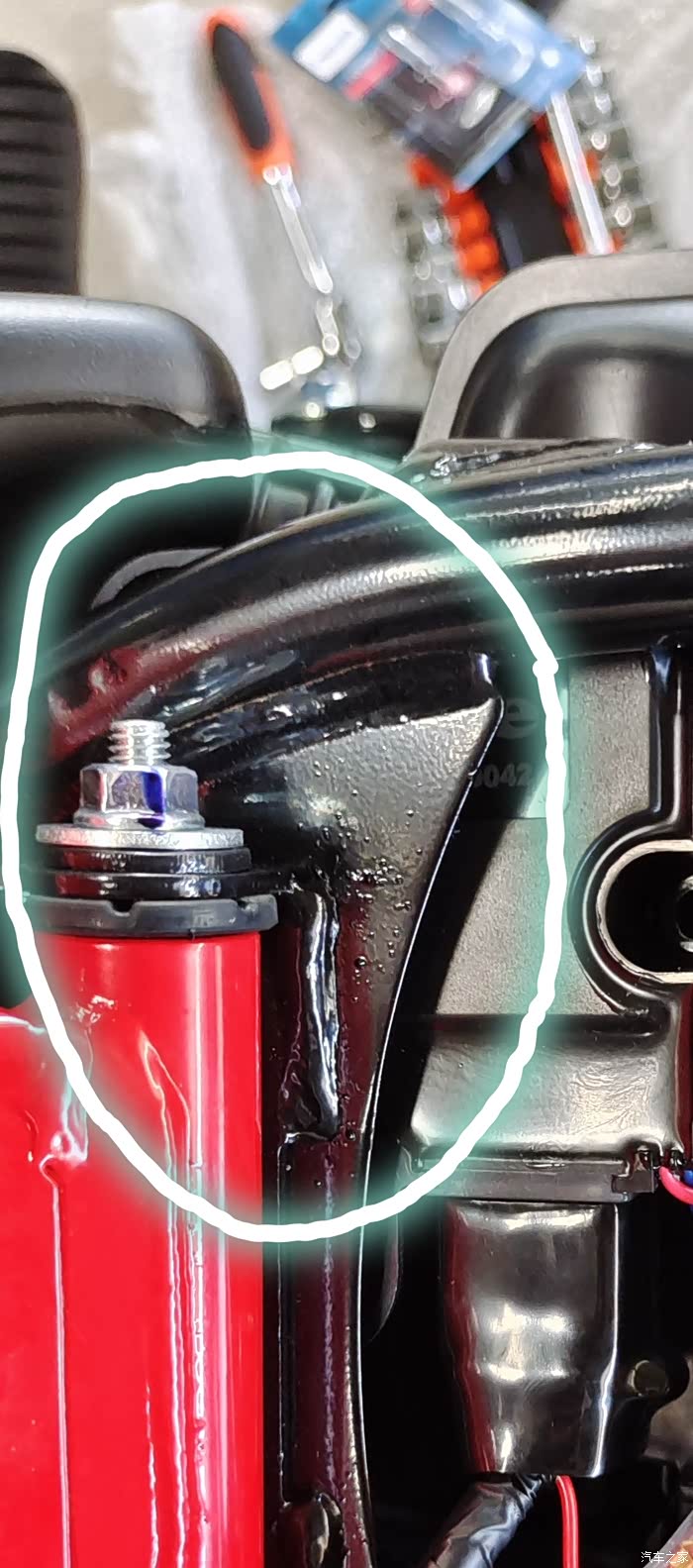 但豪爵的做工并不完美,虽然焊工还算平整,但类似这里的焊渣在车架上并不少见,大粒的已经到了毛刺的程度,懂行的大佬说说焊接后的清洗工序能否把焊渣完全去除?