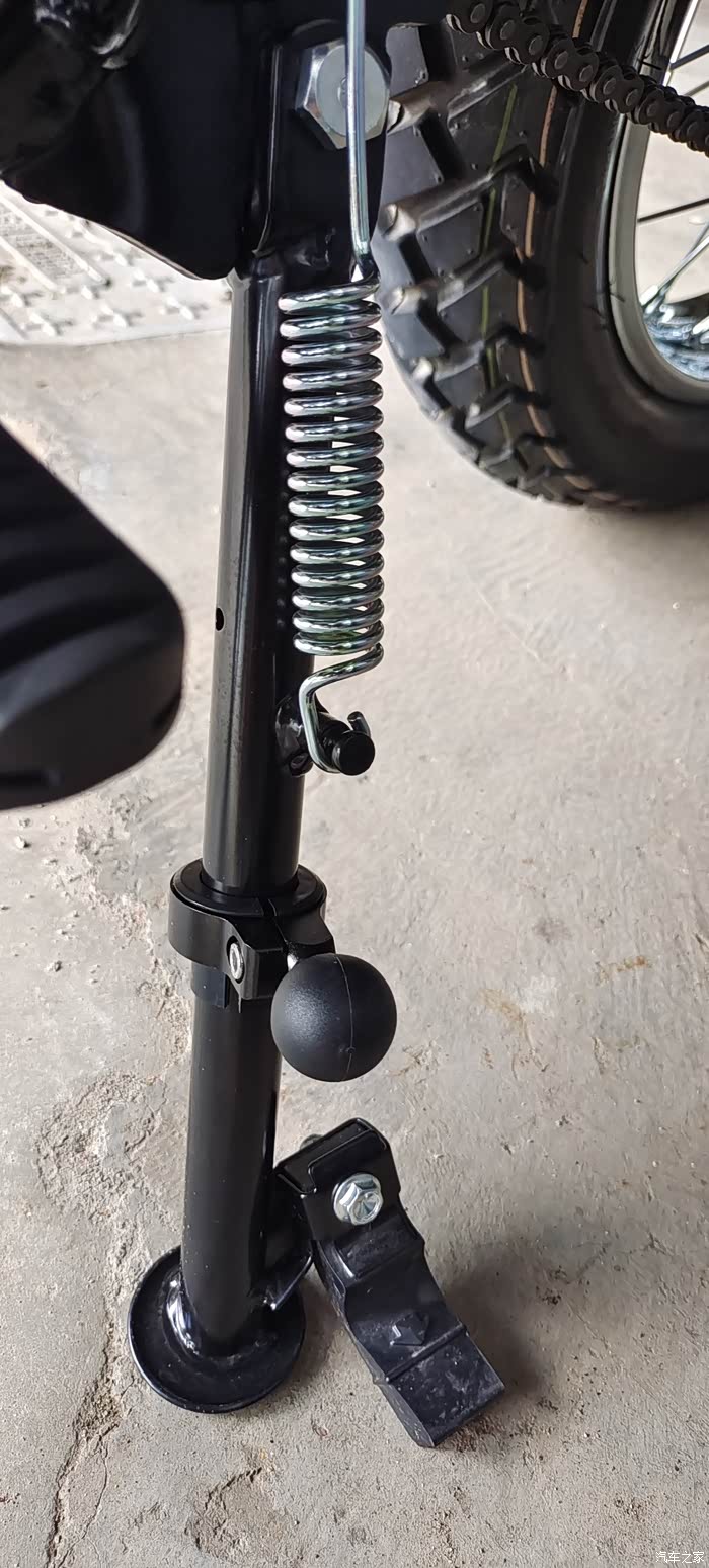 脚撑没有脚踢杆是另一个匪夷所思的脑残问题,提车小记也提过。原车能施力的地方无非就是弹簧支点和末尾橡胶块,且必须转头回看,低头看拉力盔必撞左后视镜。解决办法是借用自行车车把固定球头底座做脚踢,很好用