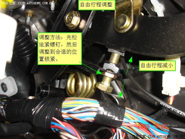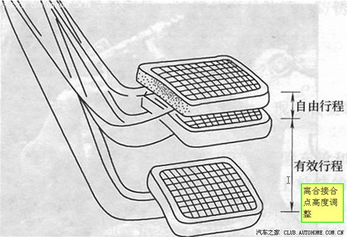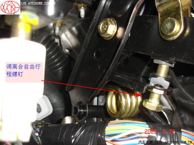 2.调整螺杆长度,螺杆收短,则离合踏板行程变短,抬高踏板较少便可进入半联动状态,反之则接合点变高.