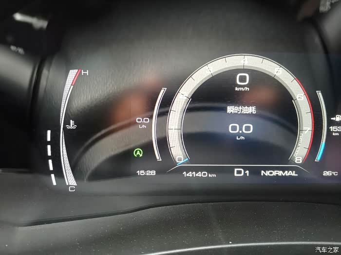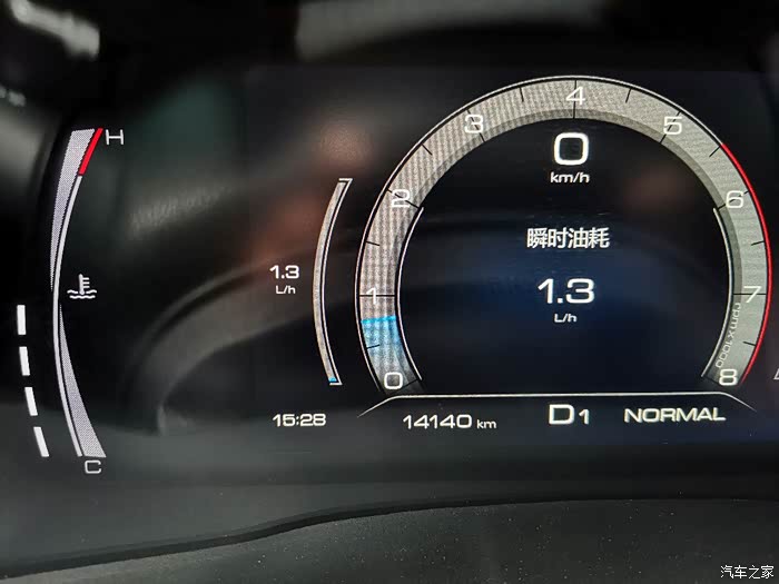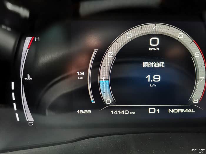 这是轻踩刹车时停稳的状态,速度为0,瞬时油耗为1.9升每小时,也就是正常怠速状态。