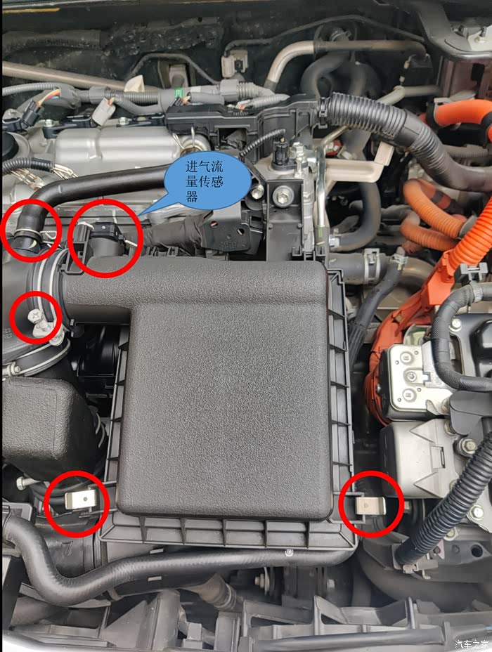 先拆空气滤清器总成。将图中红圈处的通风管拔开,进气流量传感器插头拔下,松开进气管上的卡箍,空气滤芯盖的卡扣。