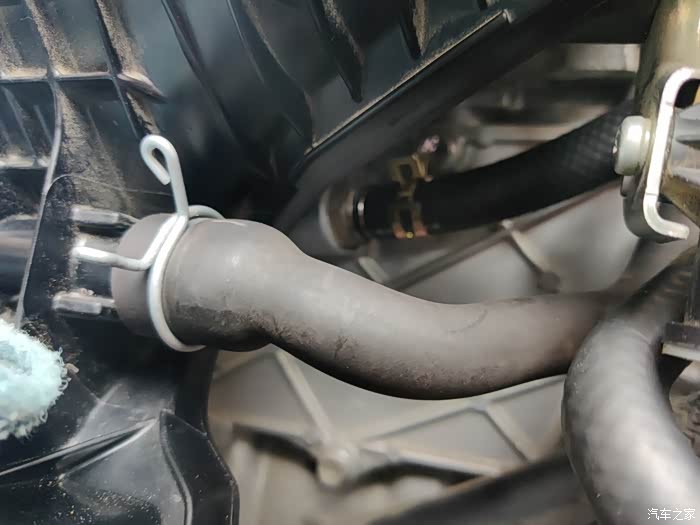 用钳子捏紧进气管下面的卡箍,比较紧,使其松开,取下进气管。如果你的手比较小,这步和下部可以省略。我为了方便安装和顺便清理一下节气门,所以把节气门一并拆下。