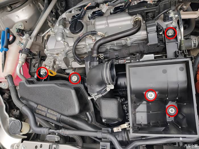 拆掉红圈处螺丝,取下空气滤清器总成。