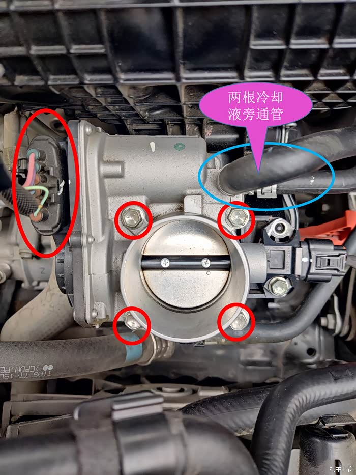 拆下红圈处4颗螺丝和节气门排线插。注意篮圈的旁通管不用拆,里面是防冻液,弄不好会漏的到处都是。就是这两条管子比较碍事,不好下手。节气门拆下来,移开就可以了。