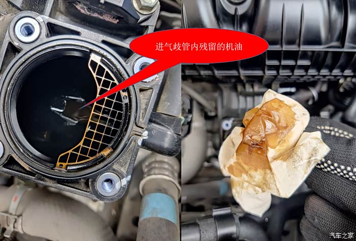 节气门下面,进气歧管底部也残留着大量的机油。这只是一部分残留,还有一部分随混合气进入气缸燃烧掉了。日积月累,节气门会变脏,喷油嘴也会脏,气门以及气缸内也会因为燃烧机油蒸汽而形成积碳。