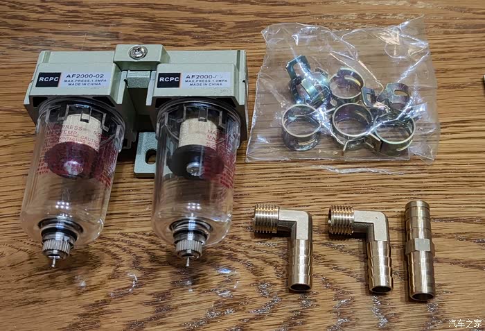 上图为改装所需零部件。某宝有卖现成的机油透气壶,但个人喜欢自己DIY,这东西也简单,没什么技术含量,所以选自己觉得合适的配件,进行改装,价格也实惠。1. 两个油水分离器组合 2.铜制接头 3.卡箍若干 4.废气管一根,忘拍了。东西备齐,下面就是安装了。