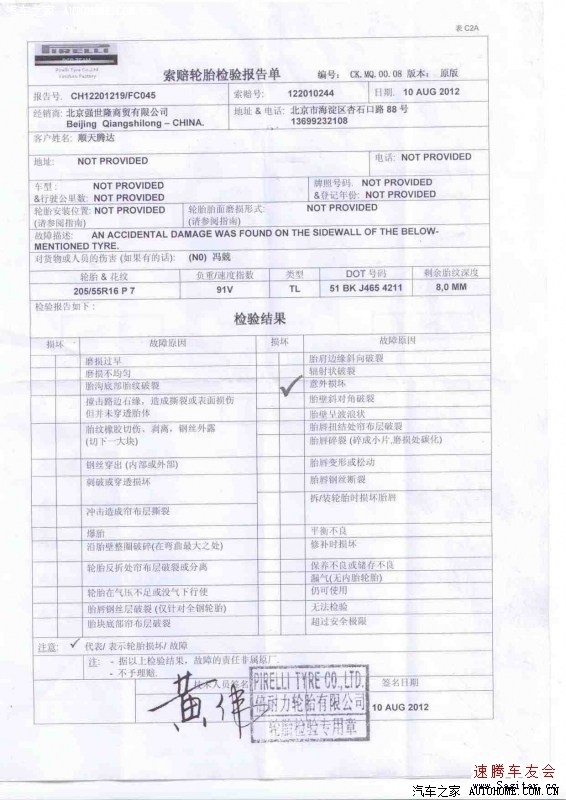 于是去找店主,过程比较曲折后叙,店主见到轮胎第一句“高速上蹾的”,我说也就春节跑了趟高速,来回七八百公里,也没见哪里有坑,平时都在北京市内跑,轮胎都蹾成这样,车得蹾成啥样啊。结果店主说让厂商去看看,索赔流程是:先交钱换轮胎,然后拿旧轮胎去找厂商鉴定索赔。换完轮胎,店主说让我自己开车去找厂商,他派了个工作人员跟着,我开车去了西五环杏石口路,号称是倍耐力北京总代理处的两个销售人员看完轮胎表示要返厂鉴定,并承诺两周内给答复,留下了我的手机号。这事后第三天,我给接待我的总代打电话问轮胎是否寄出,结果说“等工作人员来京检测,不是告诉你两周内给答复了么”,就感觉他已经不耐烦了。两周的最后一天,我打电话问进展,结果说“工作人员没有来京,又把轮胎返回山东兖州工厂了”(后经证实,国内的倍耐力是山东兖州工厂出的,从检测报告也能看出来),我说你不承诺两周内给答复么,他说这事他也控制不了,工作人员没来京也没办法。又过了三天,我打电话又问情况,结果他说“哦,你打电话的第二天检测报告就出来了”,我说那怎么也不通知我一下,从来也没人通知过进展。他说把报告放到轮胎店里了,以为店主会通知我。还说报告出来了,但轮胎还要等几天才从山东兖州寄回来,我说行,那等轮胎到了通知我一下吧,他又要了我的电话,说上次不知道记到那个手机上了。这次终于通知我轮胎到了,是那个销售人员通知我的,但是得我自已去轮胎店取。我住在北五环外,换轮胎取轮胎要到西四环,索赔跑到了西五环,如果不是有事经过,每次来回要跑近五十公里。
