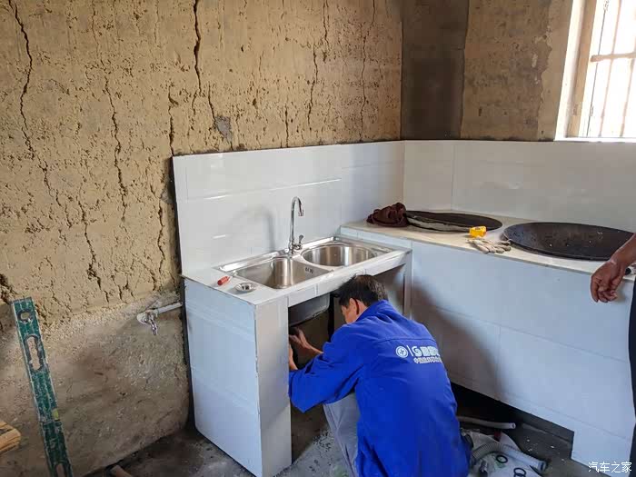 师傅是个熟练工,灶台搞好,第一时间就把洗菜盆安装完毕。