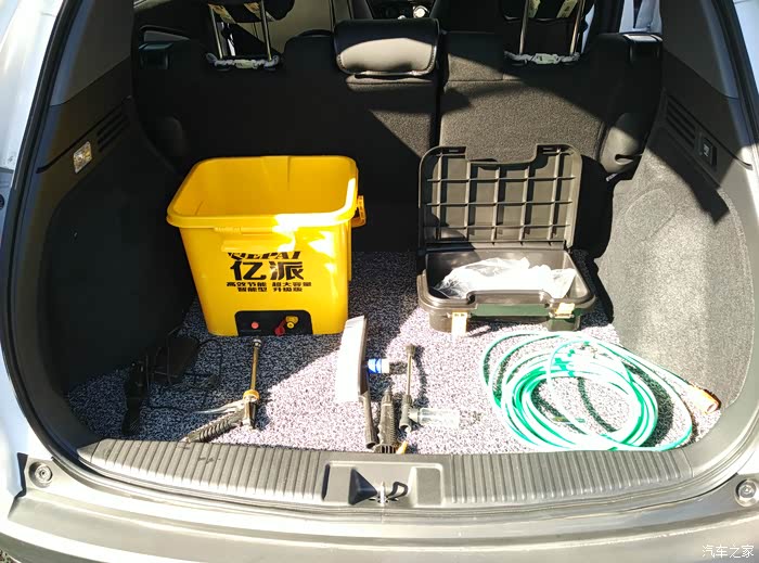 洗车套装,也是某宝的,一个36L桶,据说可以承担一个人的重量,可以踩上去刷车顶。干湿分离的,从左往右一次是车载、220V电源线,金属水枪,能出水大泡沫的毛刷和泡沫器,10m水管,黄的是电动水箱。每次洗车一般一桶水就够了,挥霍着洗两桶足够了。装进桶里放后备箱也不占地方。