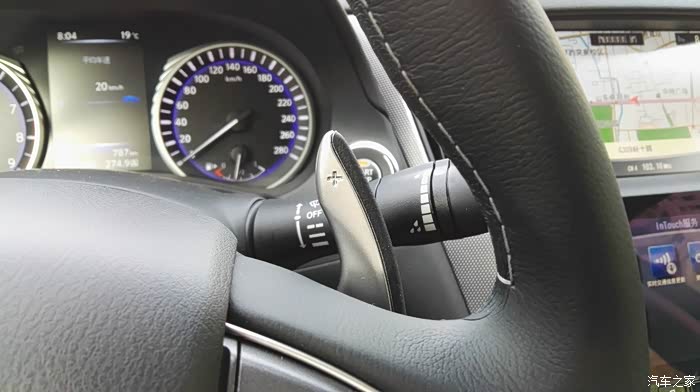拨片换挡,无法随方向盘转动(好在够长,但仍不如可随盘转的方便),英菲官方称是镁合金制,但本人觉得质感像塑料(或许镁合金就是这样的吧)。右加左减,用的不多,不清楚是否具有宝马拨动自动进入手挡模式的功能。