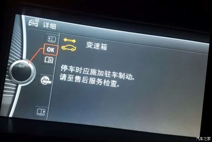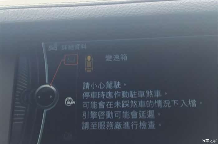 2、仪表盘提示:变速箱有异常 谨慎驾驶。可以继续行驶。加速能力降低。尽快由最近的BMW售后服务检查变速箱 请不要让发动机熄火。发动机熄火后,车辆将无法继续行驶。请立即至最近的BMW售后服务部门。变速箱 停车时应施加驻车制动。请至售后服务检查。
