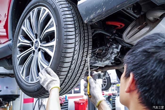 有经验的用户都知道,机油不会马上放干净。趁着这段时间,维修技师对这辆宋Pro DM进行了底盘检查,除了底盘螺丝的紧固程度之外,还矫正了轮胎气压,清理了轮胎沟槽中的小石子。这项工作不仅会保护轮胎,让出行更加安全;小石子清理干净之后,车子跑起来也会更安静。此外,维修技师还检查了轮毂轴承的润滑情况、制动片以及制动盘的磨损情况。如果某个车轮的制动系统产生异常磨损,不仅会影响车辆的驾驶感受,也会引发安全问题,而早期发现问题并加以解决,同样也会让用户的出行更安心、更安全。