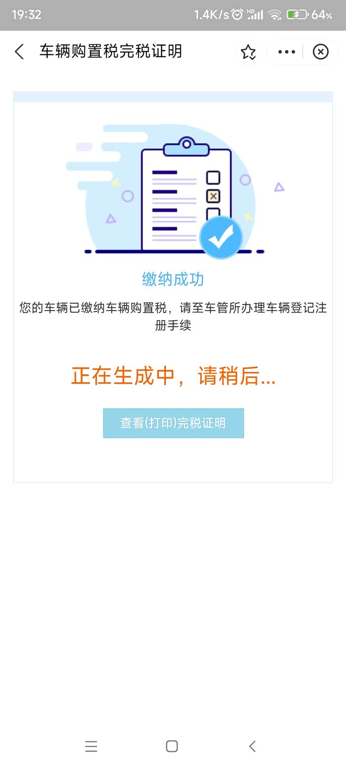 然后选择车辆购置税,点进去选第一个,车辆购置税申报,然后选上牌地区,选国产车,扫描合格证就ok了。完税证明不用打印。