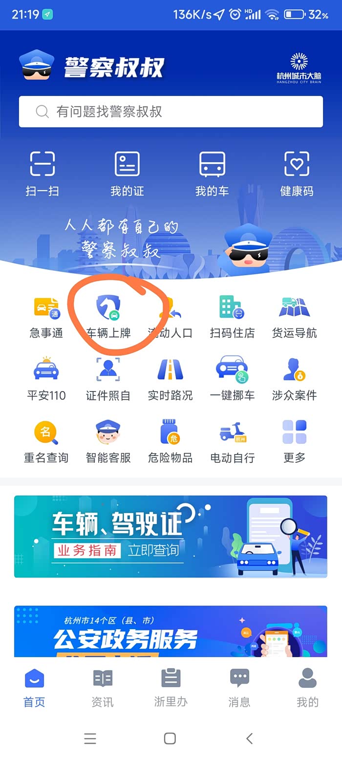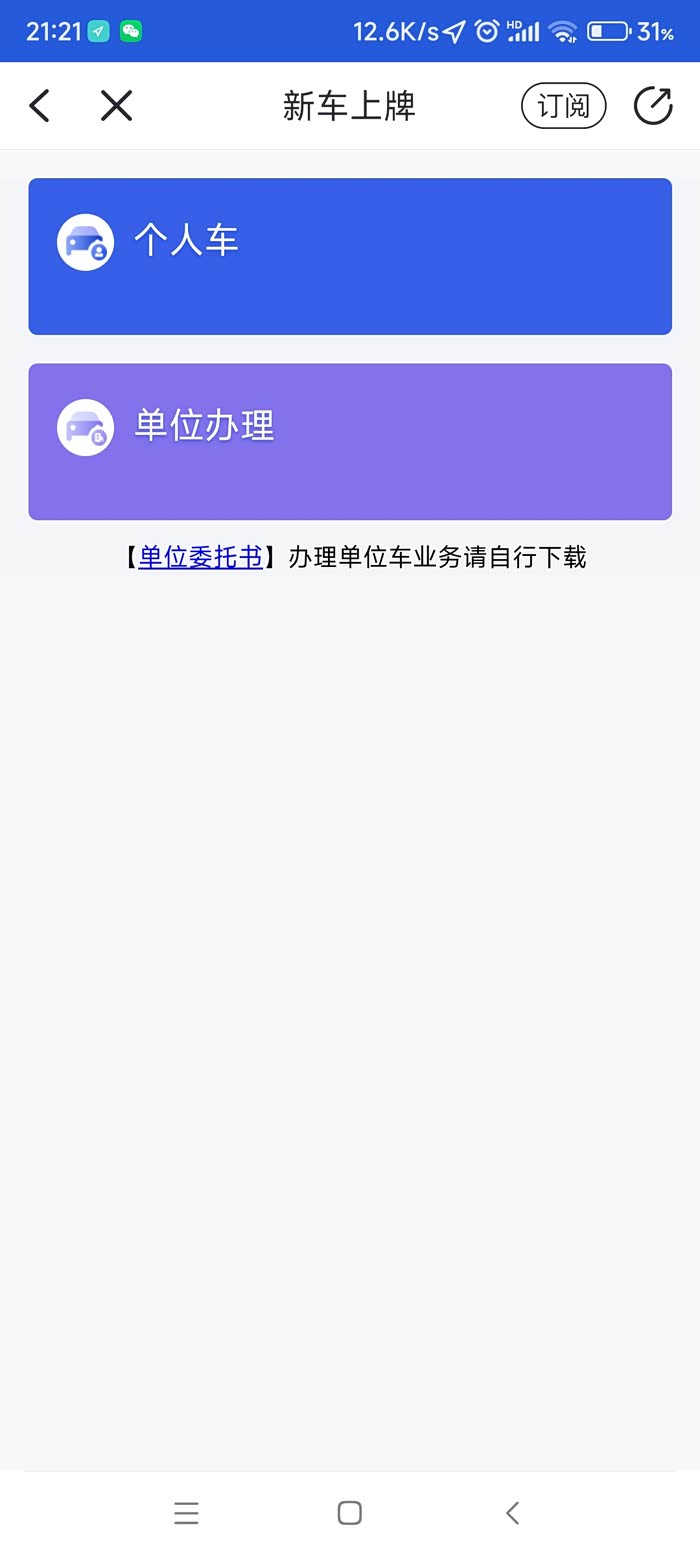 验车完成后,再把所有资料都拿着回去大厅给工作人员看看,整理一下,这时所有需要在代办点做的事就全部都做完了,我从进停车场到出停车场,只花了31分钟,停车费5元,可以说是相当快了。接下来就要在警察叔叔app上操作了。打开app首页,点车辆上牌-新车上牌,然后私家车选个人车,公司车辆就选单位办理。