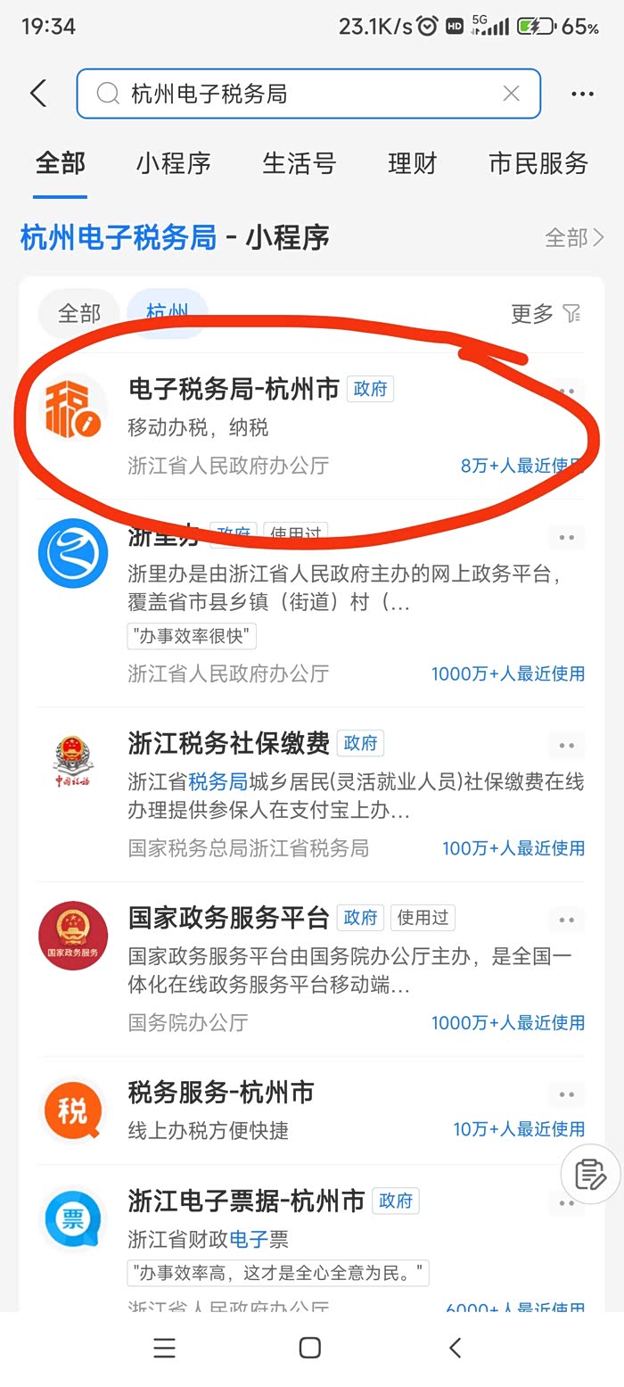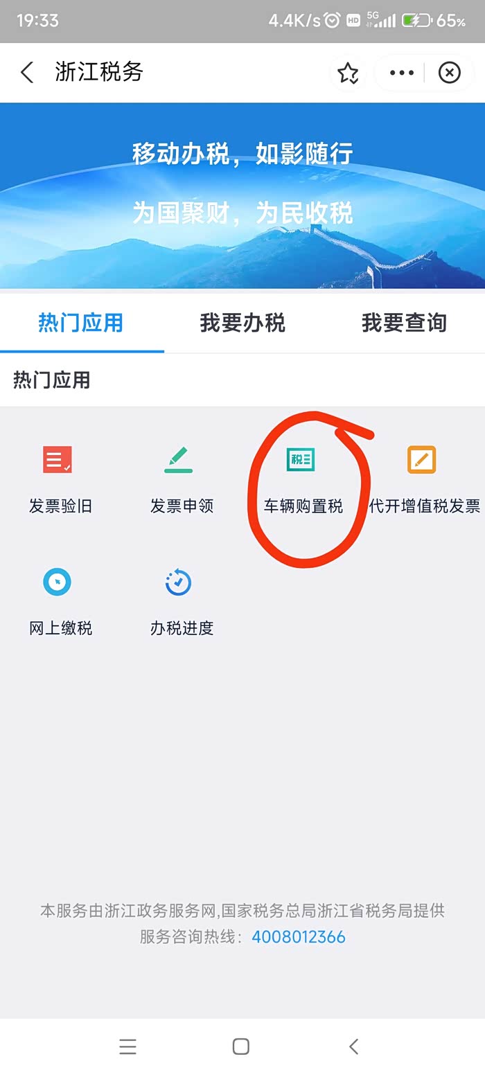 指标搞定后,第二步就是办理购置税完税证明。打开支付宝,首页搜索“杭州电子税务局”