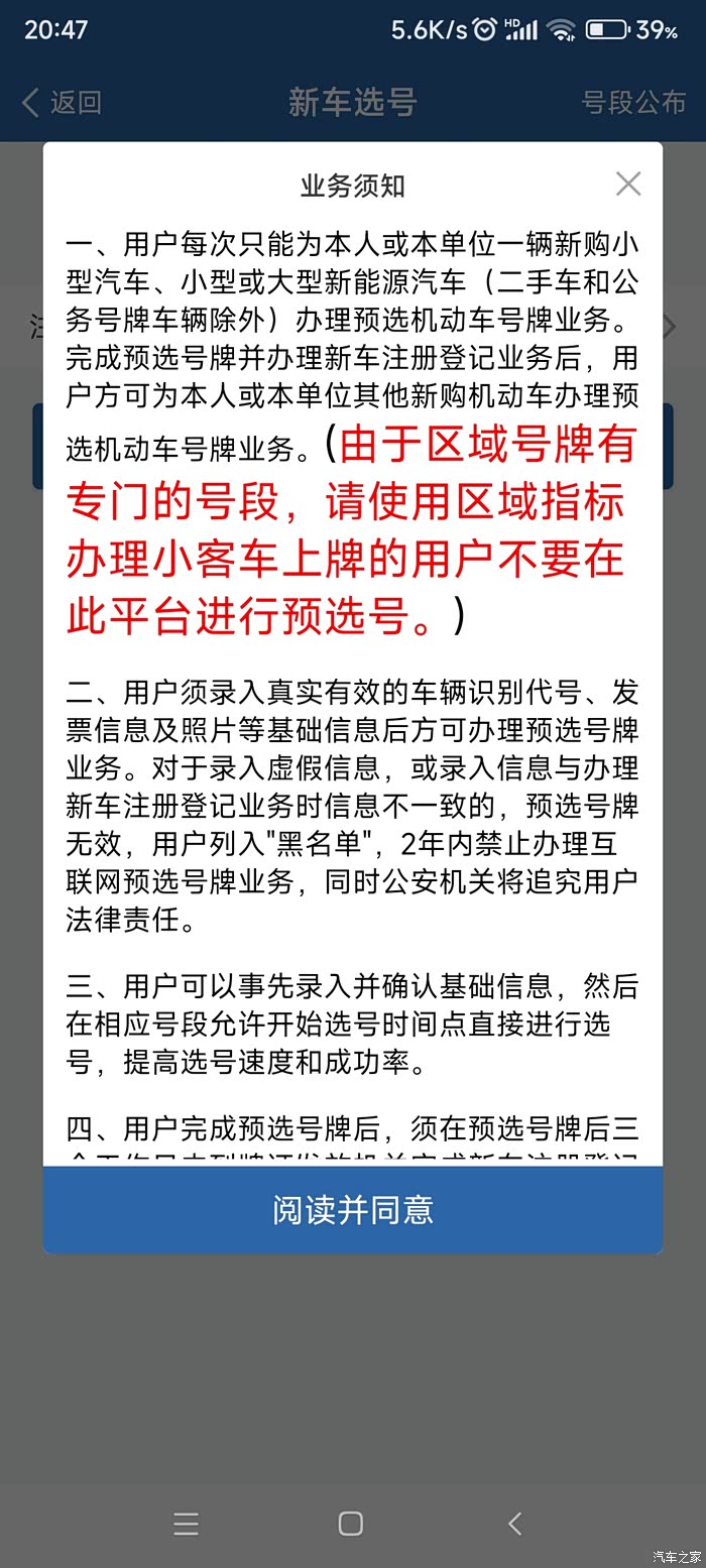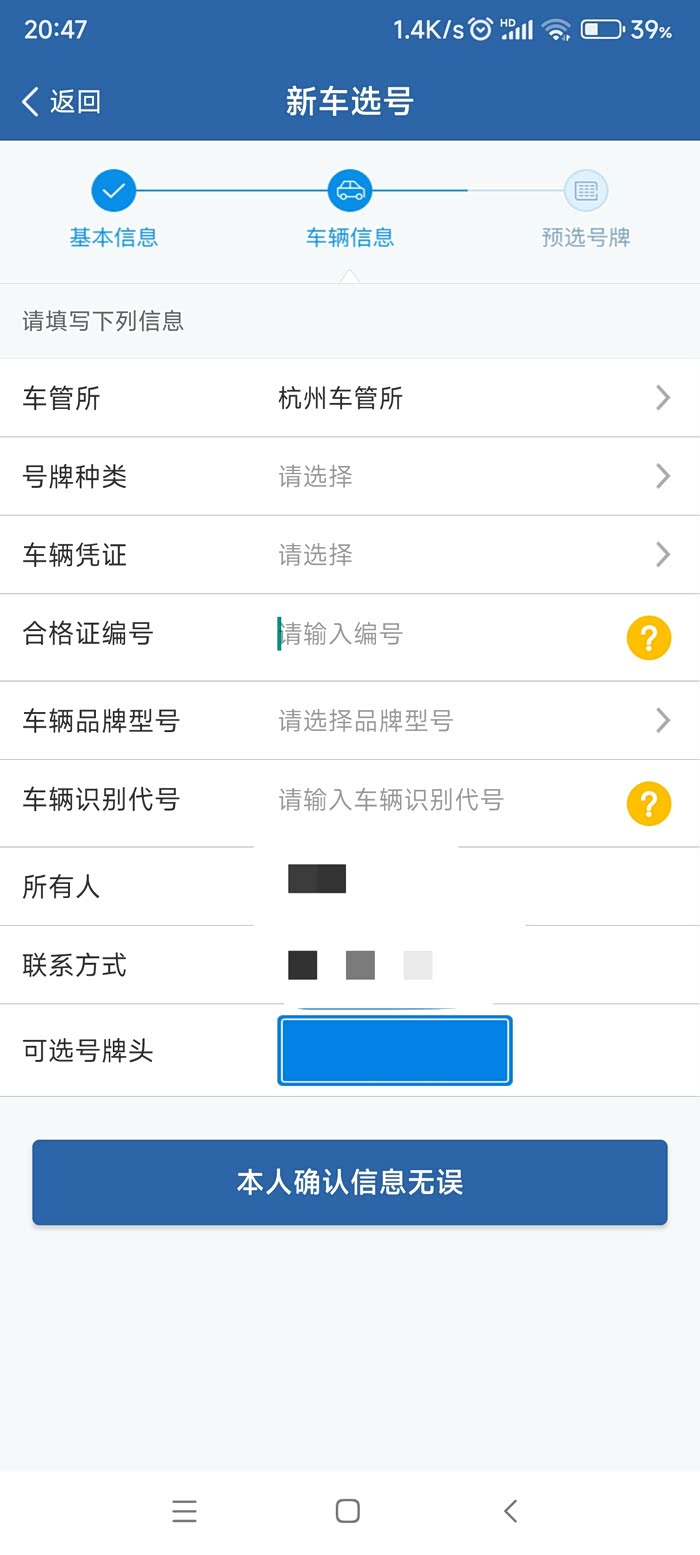 这两步完成后,可以直接去现场验车,也可以先在交管12123app上预选号牌。进入123123首页-更多-新车选号-同意-确认信息后就可以选号了,可以自编也可以随机5次十选一。这里如果选不到心仪的号码,千万不要点确认选号,不要就不用去管它了,还有50选一的机会,后面会讲到。