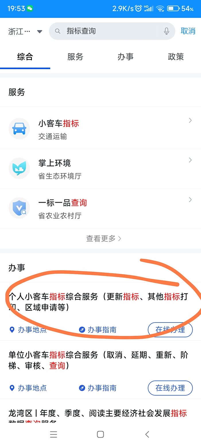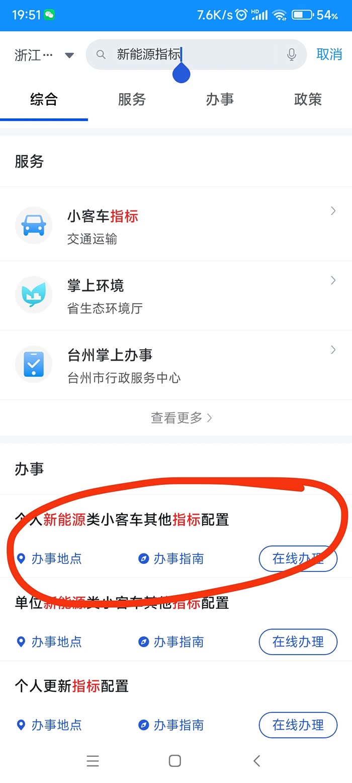 首先第一步就是申请新能源指标。打开浙里办app,搜索“新能源指标”,找到图示,然后点“在线办理”