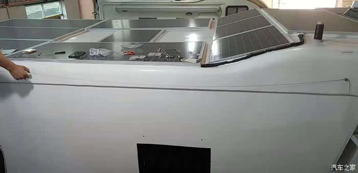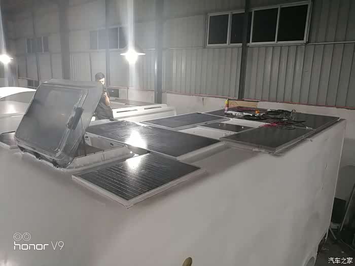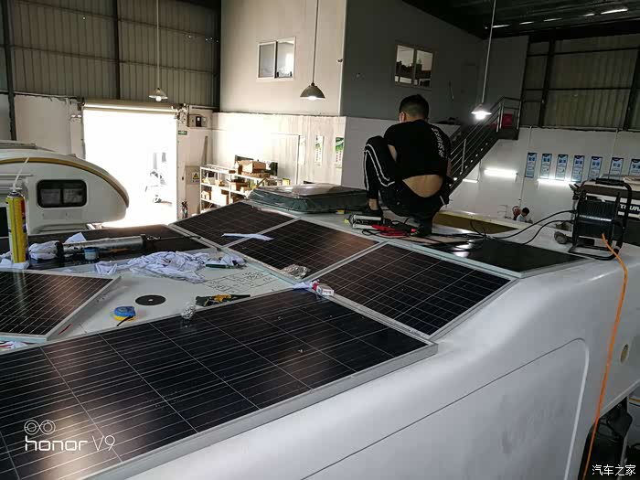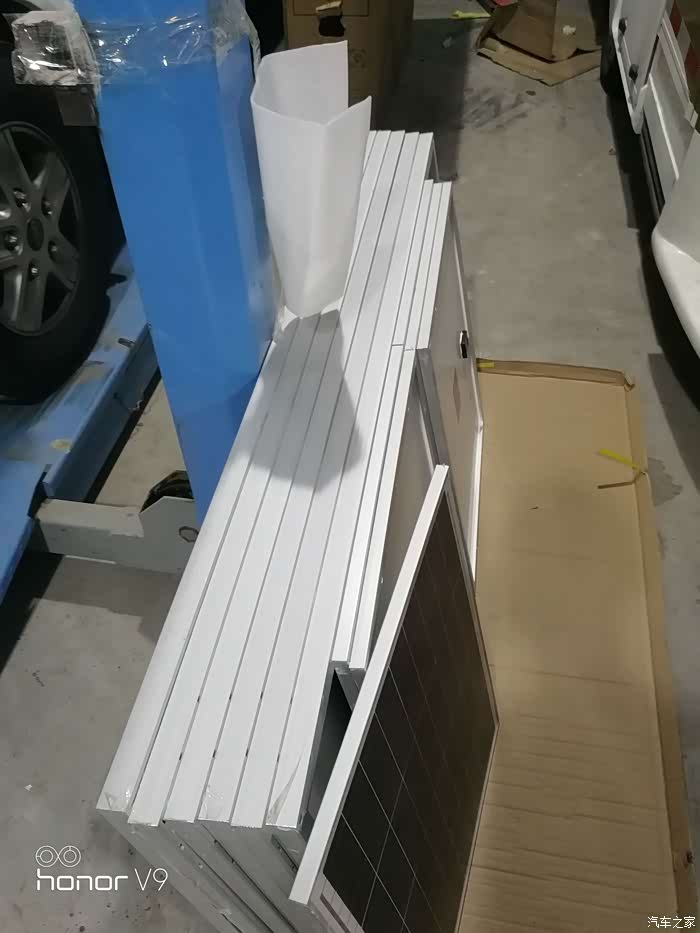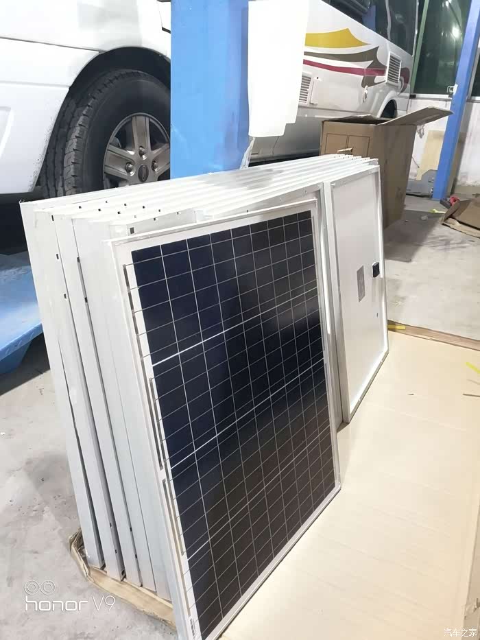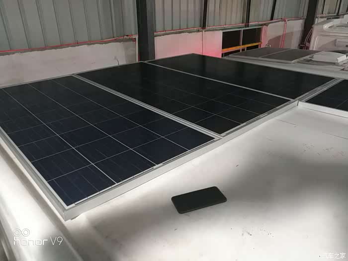 跟老板和具体施工的师傅商量好,在保留额头天窗的前提下,最大限度铺设太阳能板,经过比玩华容道还伤脑筋的测算之后,赢是让我塞下了1200W的硬板,如果不要天窗的话,还能再多150W。老板电话订购太阳板,不